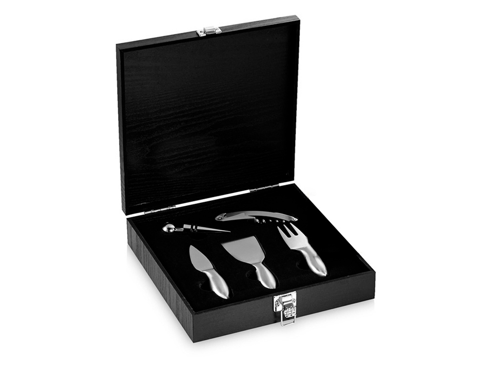 Набор для сыра и вина Mino. В этот набор из 5-ти предметов входит три ножа для мягкого сыра, твердого и зрелого сыра, стоппер для вина и штопор. Набор предлагается в деревянной подарочной коробке с шильдом 40 х 25 мм для лого. Гравировка (CO2 лазер) (Без чернения) на данный товар осуществляется бесплатно. Оплачивается только настройка оборудования в размере 1100 рублей на весь тираж.